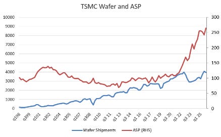 I have been sceptical about the AI trade. The main reason was that pricing for AI chips looked so out of whack for pricing for other chips, my assumption was that eventually supply would overwhelm demand and pricing would fall. I looked at TSMC pricing history, and thought we were similar to the dot com bubble. In other words, I felt like I missed the move, and it was all downside from here for AI related themes.
