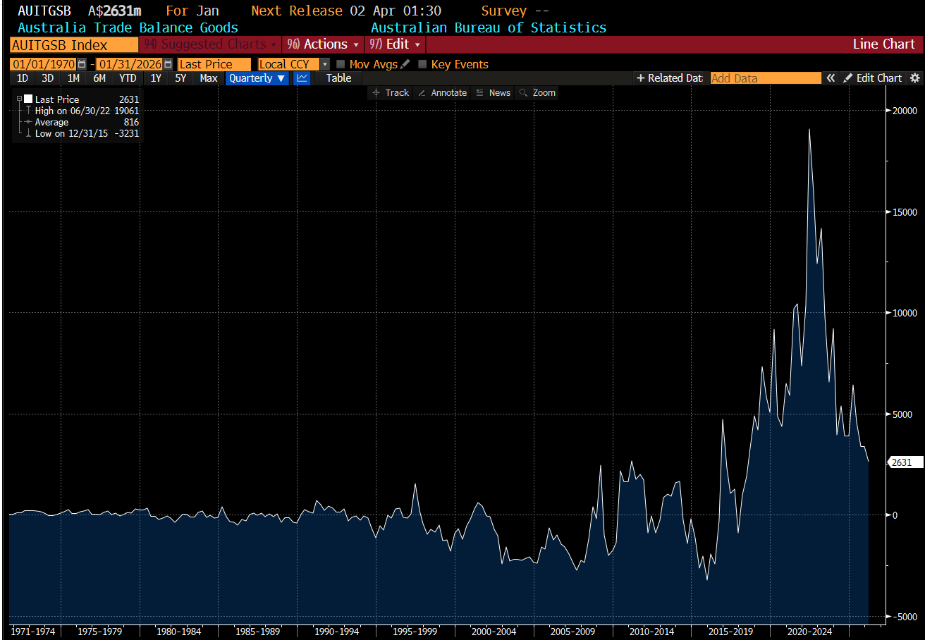 This breakdown between the currency and terms of trade led Australia to book huge trade surplus - something never really seen in Australia before.