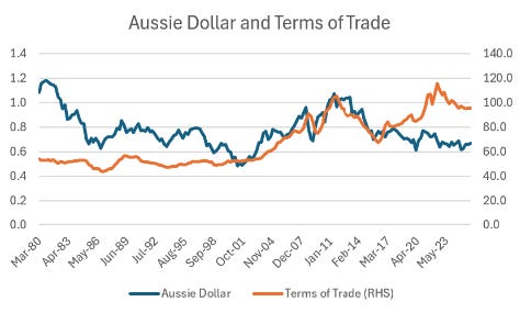 The Australian dollar used to follow its terms of trade pretty closely. Commodity prices up, Aussie dollar up. From 2016 this relationship has broken down.