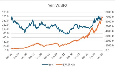 For many years, Yen was seen as a safe haven currency - doing well as when the S&P 500 was weak - but in 2022 it weakened ever as the S&P 500 fell.