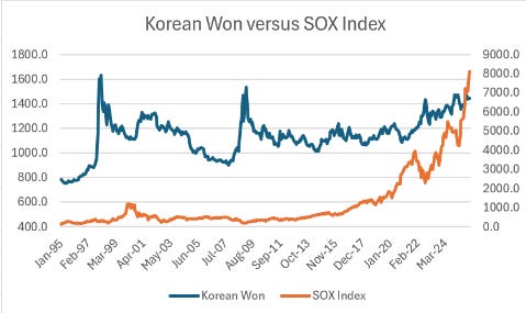Korean Won used to be highly correlated to SOX Index (a measure that tracks the performance of semiconductor stocks), but in recent times Korean Won has weakened even as semiconductor shares have been on an astounding bull run.