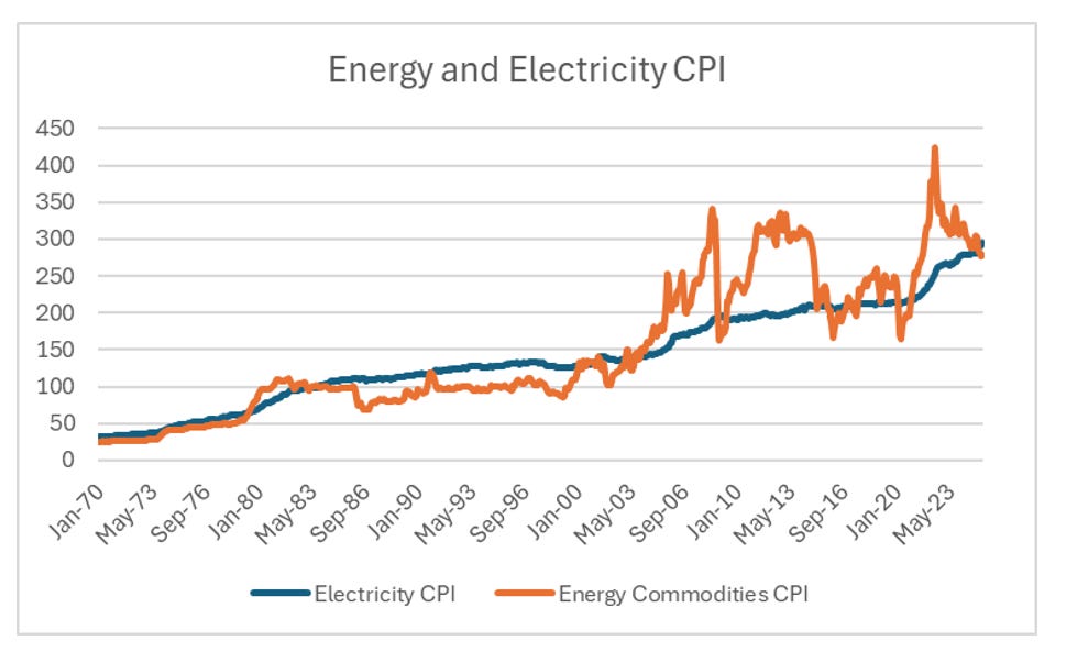 I could see treasuries getting a bid if the capex story from the hyperscalers broke down - but there is no sign of that. One of my theories about the “pro-labour” era is that trend inflation was higher, but it would look “ok” during periods of commodity price weakness. A good example now is US Electricity CPI and Energy Commodity CPI. Energy Commodities are the same price as 20 years ago - but electricity CPI is up 40% and rising.
