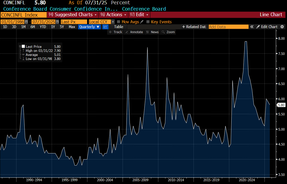 The problem with buying treasuries is that we have learnt during Covid that the US government will spend whatever it takes to stop a recession. There is no real reason to think President Trump would be any different. Firing the BLS Secretary seems to send a strong signal that he will act to counter any recession. Conference board inflation expectations are still at very high levels.