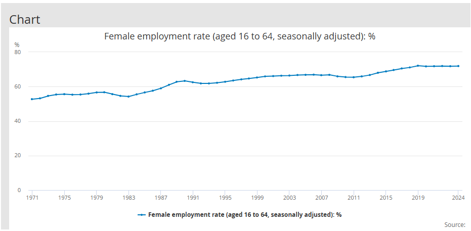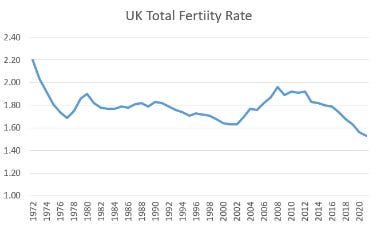 One idea I have had is that the fall in fertility has been driven by women becoming mothers later in life, which has reduced the ability to have multiple children. If we look at workforce participation by women, it took off in the 80s. In the UK, female participation rate was 50% in 1970, and is now closer to 70%.