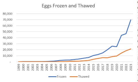 The question then is how many eggs are getting frozen, and how many are getting thawed. HFEA gives us that data as well. It is the frozen number that is getting me excited. I knew that freezing eggs is becoming more common, but to see some hard numbers is exciting.