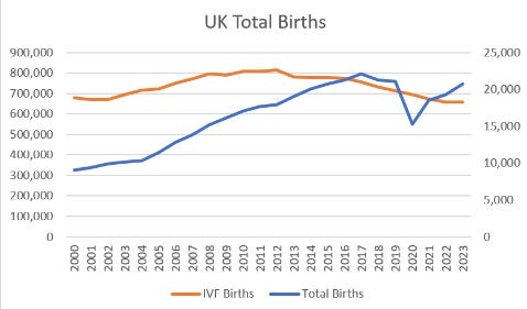 One option would be go “Handmaids Tale” style and ban women from work. I feel this is somewhat extreme. A much better method would be to use technology to extend the period over which women can give birth. Looking at UK IVF data, this option seems to be coming into view. IVF births now make up slightly more than 3% of all births in the UK, bouncing back after a Covid slump.