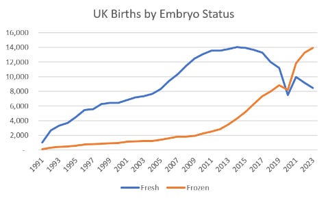 This by itself is not that impressive. But hidden in the data from HFEA is some very interesting shifts. The majority of UK IVF births comes from frozen embryos. If we do a HUGE generalisation here, lets say the majority of fresh IVF was by mothers who needed help conceiving (that is they want to be pregnant now). And frozen embryos are from mothers who decided to freeze eggs until the time is right (that is they want to be pregnant in the future). It is more complicated than that, and also driven by huge improvements in freezing and thawing technology - but as a generalisations go its okay.