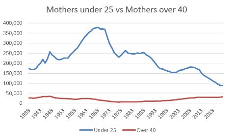 Eyeballing these numbers, there seems to 6 to 7 year lag between freezing and then thawing. I have no proof that this relationship will hold, but just for argument’s sake, I will assume it holds. Using rough numbers, this would imply about 60,000 IVF births from frozen embryos in 2030. That would move IVF to 10% of all births in the UK (around Japanese levels today). But what it would also mean is that the effective age at which mothers could stop becoming pregnant would also be pushed back. If 10% of mothers have their first child with IVF, and if those mothers have eggs frozen, should we also begin to see an exponential rise in older mothers. There already signs of this, but if we look at eggs being frozen only really taking off in the 2020s, we should only see a surge in the 2030s.