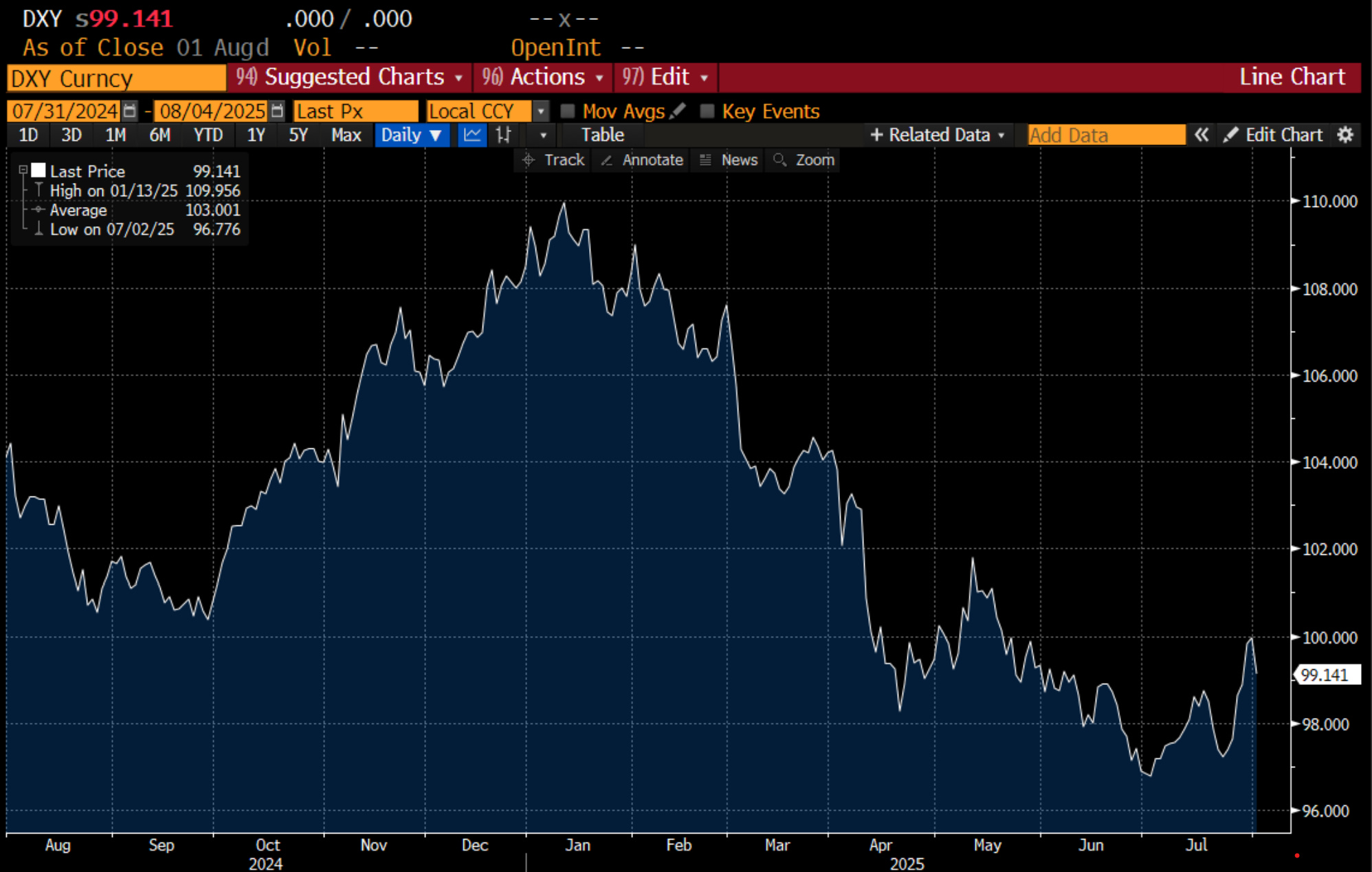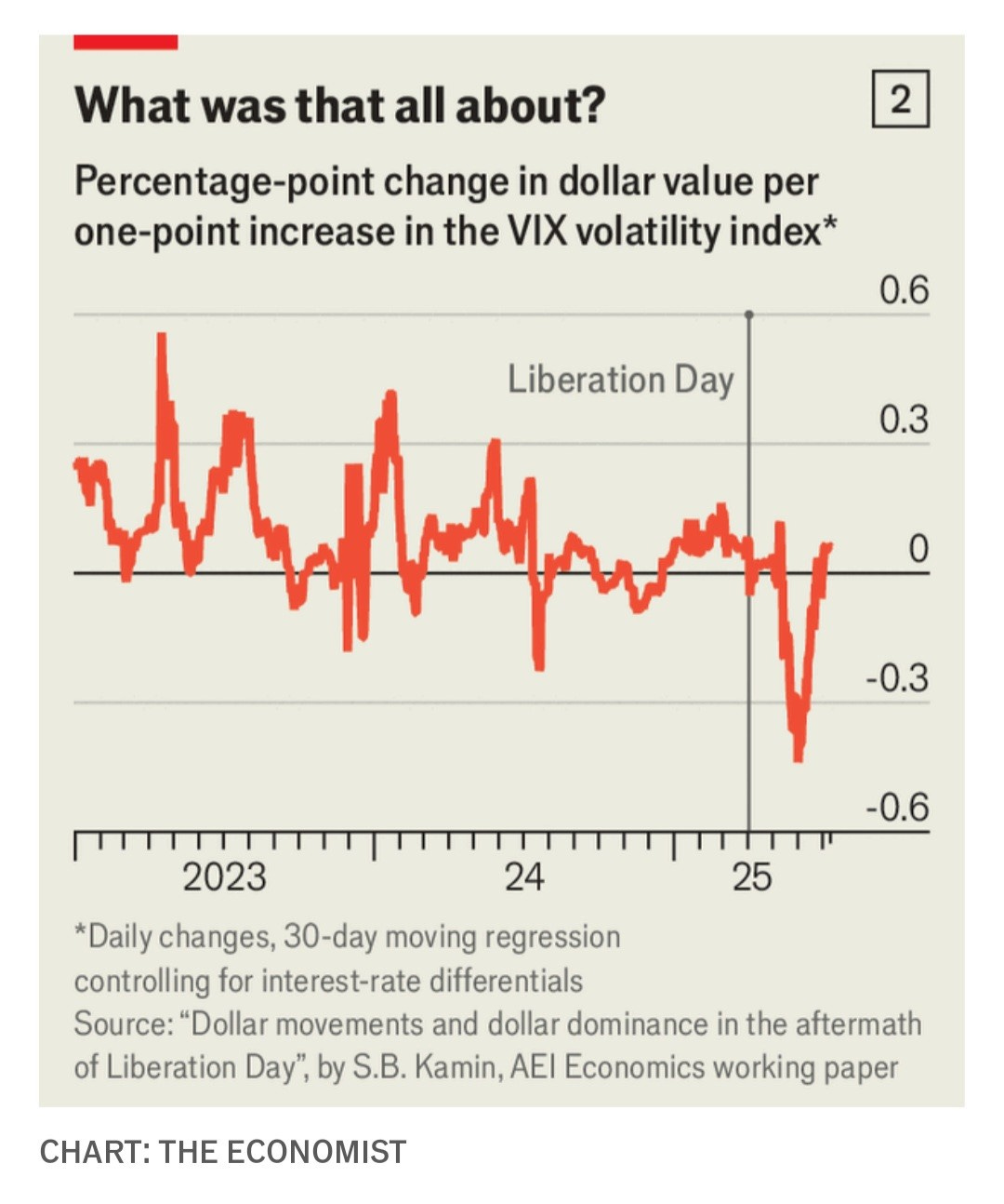 With so many core themes reversing in the final week of July, we ended up having a down month. However I did take of the advantage of the strength of the dollar to add to dollar weakness trades. As much as the late month trend reversals disturb me, I can not forget the “correlation break” we saw earlier this year, when treasuries and dollar sold off as equities weakened. The Economist provides a useful graph.