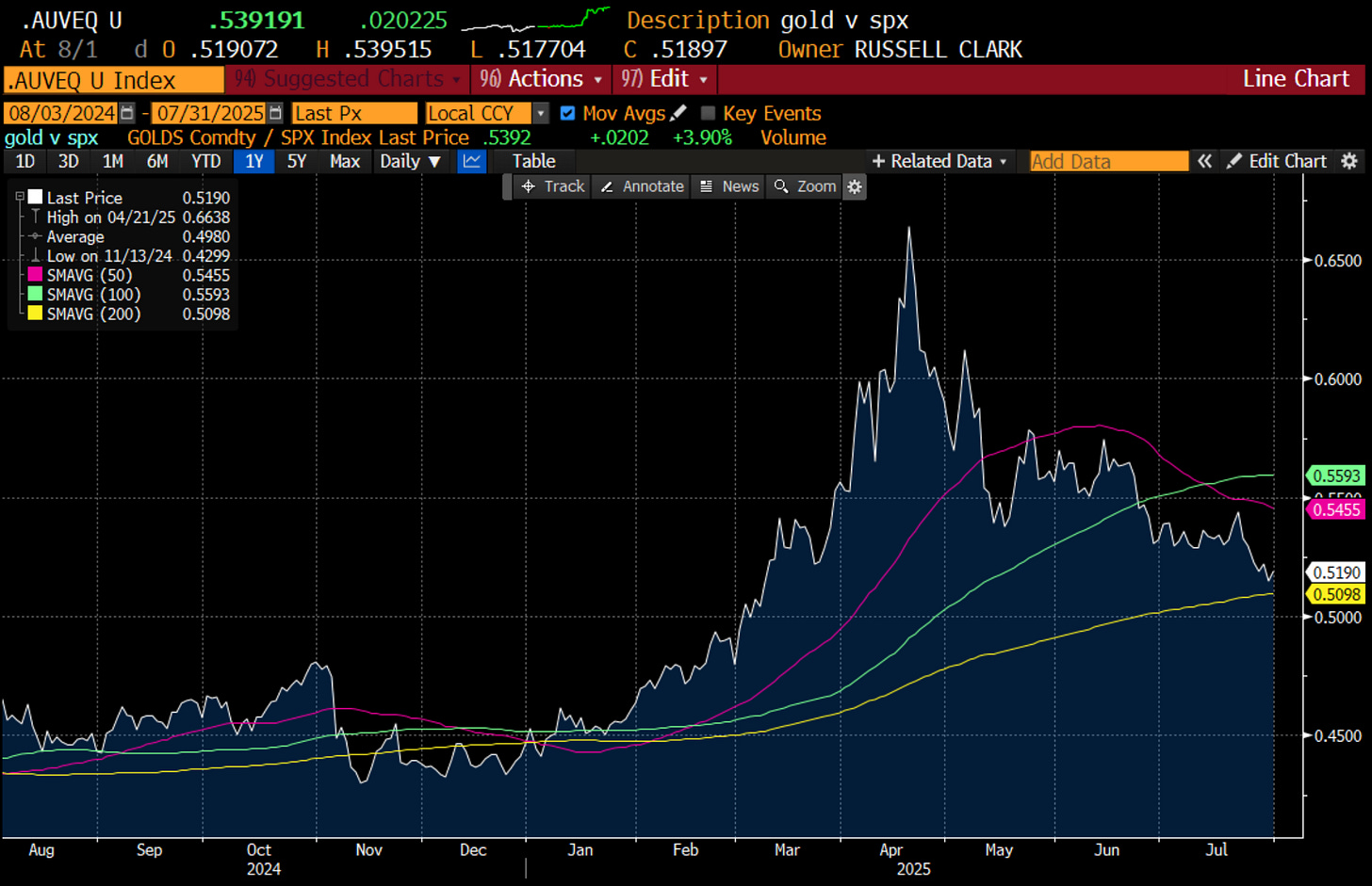 The other core trade of gold versus S&P 500 had a late month breakdown to approach the 200MDA.
