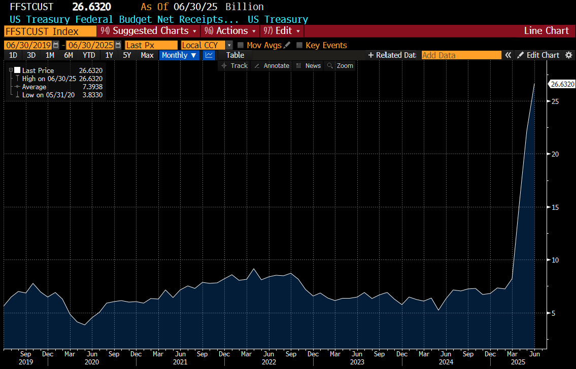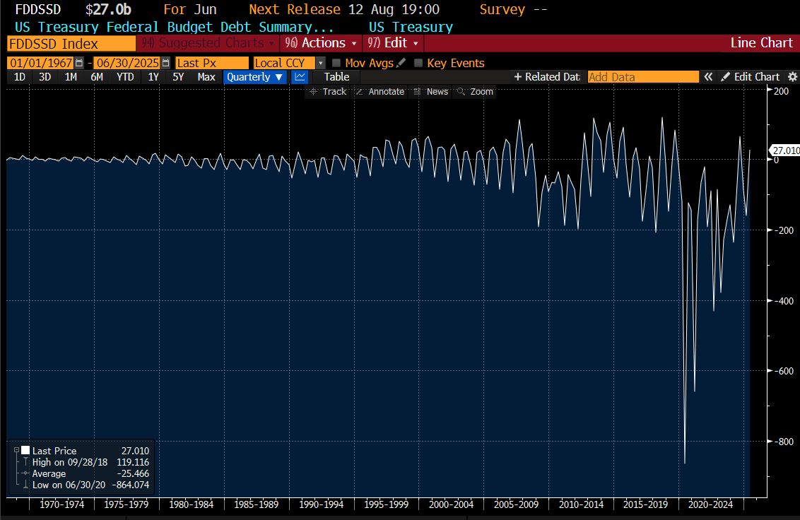 President Trump has eschewed obvious options like taxing private equity, or progressive taxation for DOGE and tariffs. Neither seemed remotely likely to balancing the budget. But when we look at the monthly summary, June saw a 27bn surplus, compared to 71bn deficit in June of last year - a close to USD 100bn improvement.