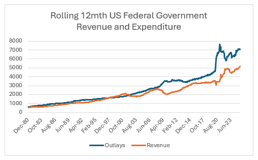 Generally speaking the US government fiscal position has looked terrible. On a 12 month rolling basis, for the last 15 years despite full employment and record asset prices, revenue to the US government has never looked close to meeting outlays.