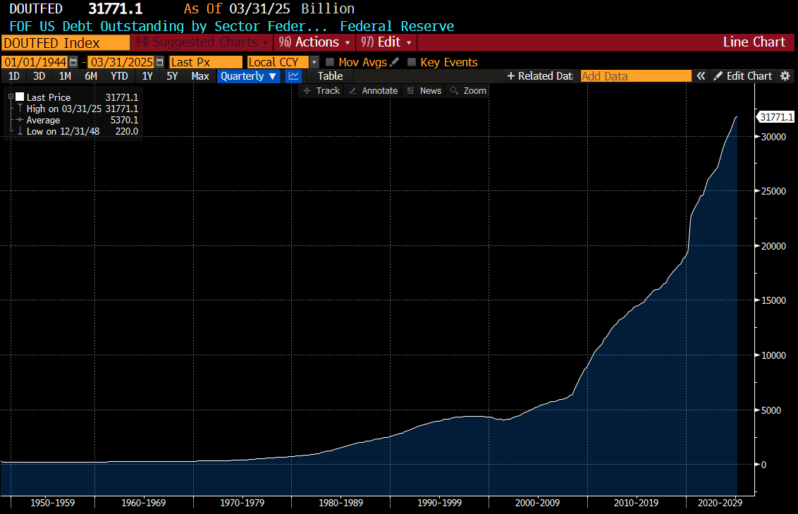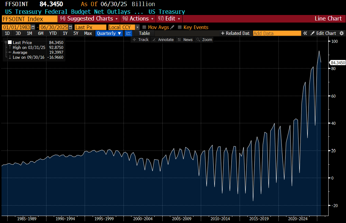 If the Federal Reserve could cut rates back to 1 or 1.5% and get monthly net interest spend back to USD 20bn a month, that would also help. What happens with 30% tariffs and 1% Fed Fund Rate? An increase of USD 100bn in revenue (custom duties and higher wages driving higher income take), and 1% Fed Fund Rate would give 60bn cut in expenditure. 160bn a month, over 12 months would be close to USD 2 trillion, which is pretty much exactly what the Federal Government Budget gap.