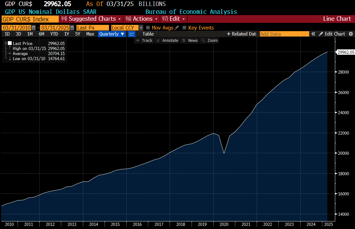 I assume 15% wages increase and 30% tariffs and 1% interest rates would be pretty inflationary, so maybe US GDP grows by another 25% in the next 4 years. (It has grown 50% in the last 5). This would give USD 37.5trillion GDP, up from USD 30 trillion today.