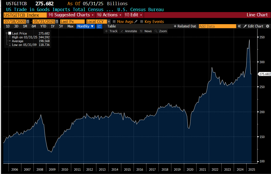 How high could this number go? Well the US is importing around USD250bn a month steady state, so we can simplify and say there was an effective 10% tariff in June.