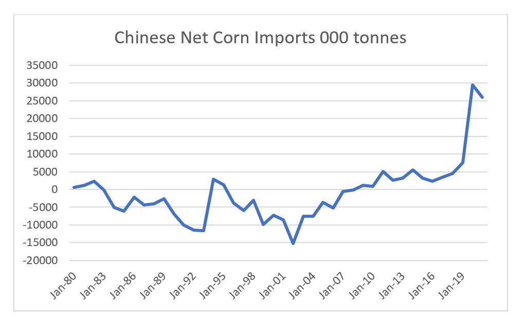If you think of a pig, as a store of grain (4 kg of grain is needed for 1kg of pork), Chinese needed to rebuild inventory. The upshot was that China has moved to becoming a very large corn importer.