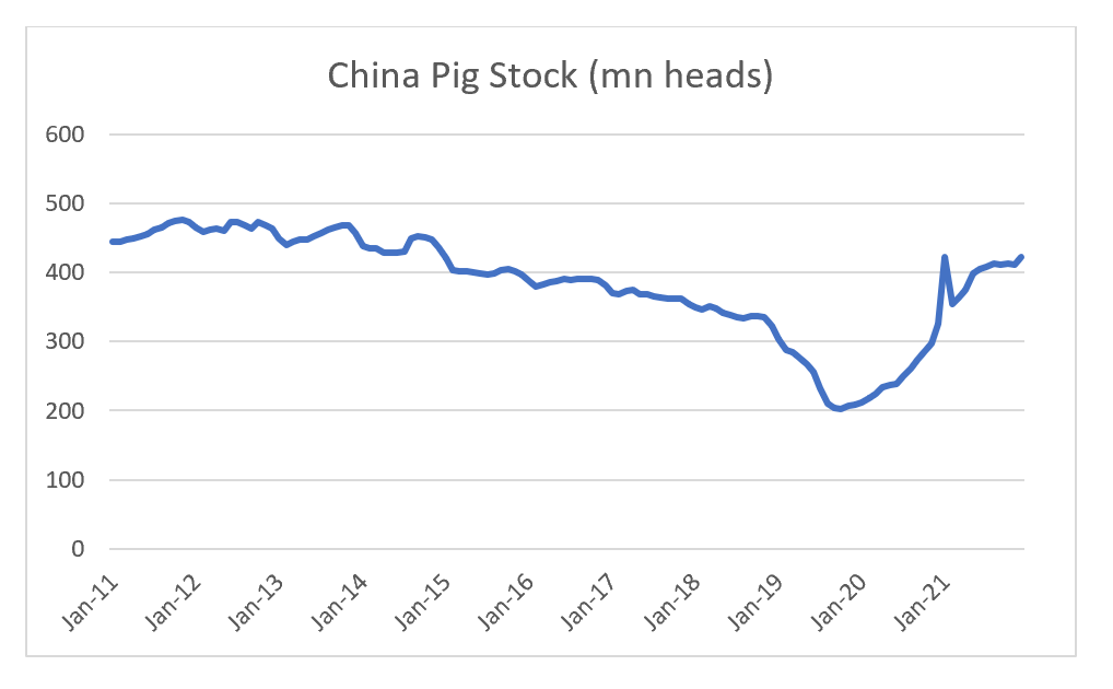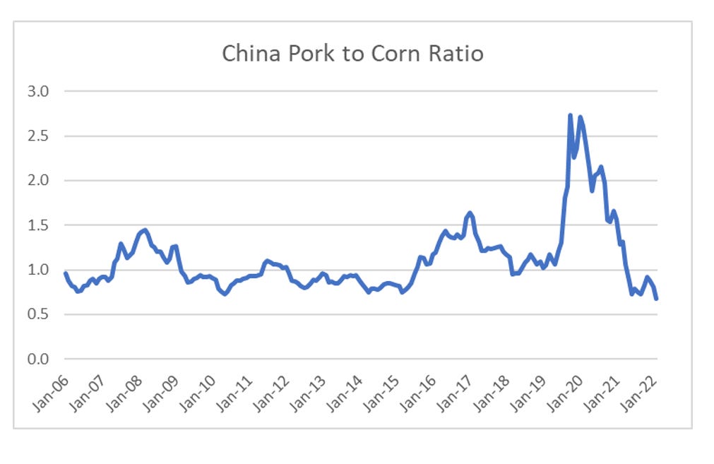 Pork farmers tend to look at pork/corn ratio as a guide to profitability. This spiked to all time high in China in 2020