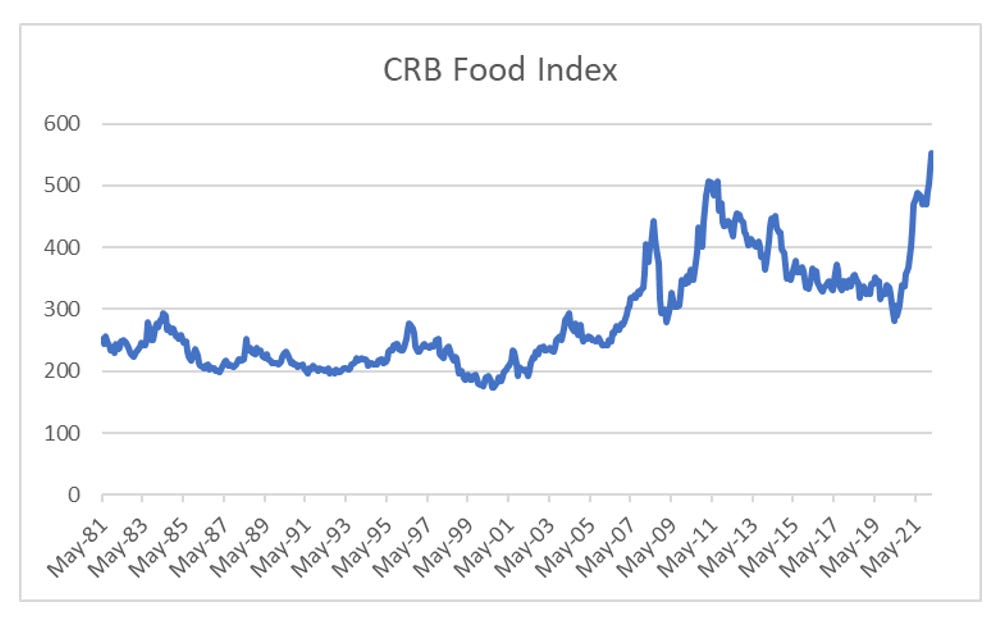 The move higher in food prices so far, has been driven by two shocks. The first shock was African Swine Flu, which decimated Chinese pig herds in 2019, but have been rebuilt since then.