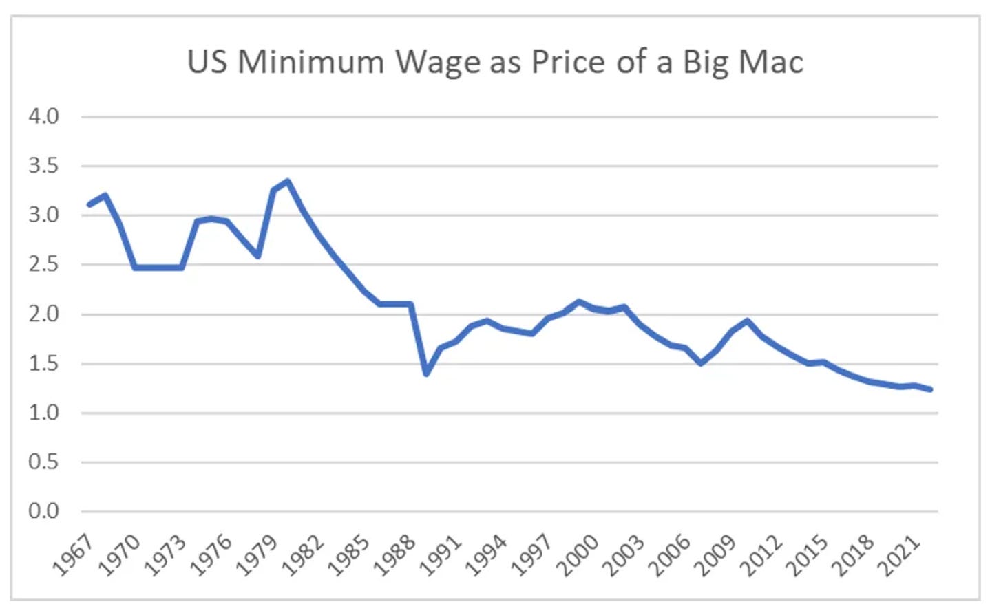 But one bit of work I did a while ago was comparing the US minimum wage to the price of a Big Mac. In the 1960s and 1970s, you had a minimum wage that was equal to 3 Big Macs. If you thinking about someone working a low skill job, three Big Macs an hour meant you had another money for food and everything else from a hard days works. Last time I updated it in 2022, we were closer to 1.