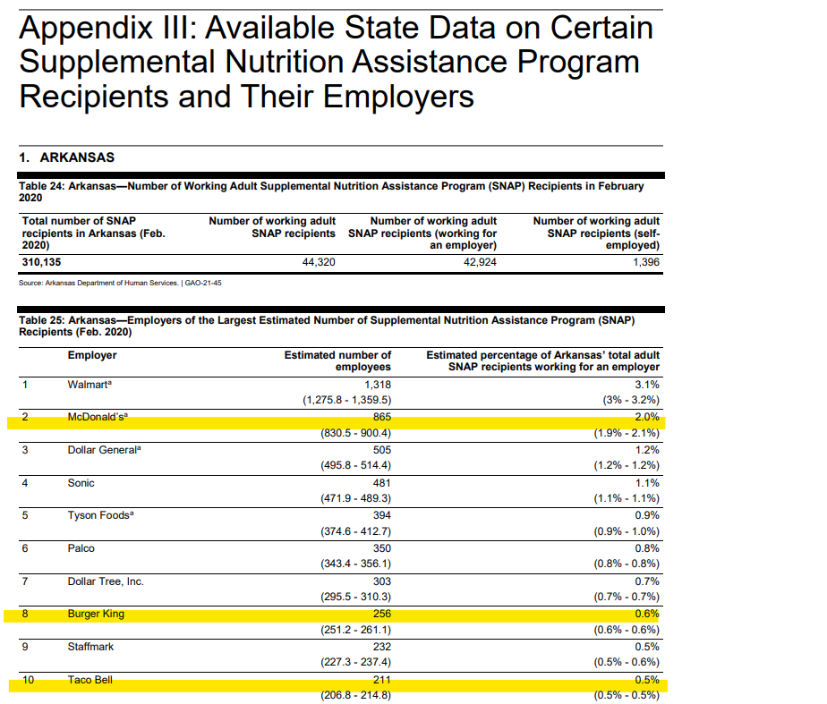 These days, many fast food workers require food stamps to make ends meet. Arkansas is not an outlier here - you can read the report yourself.