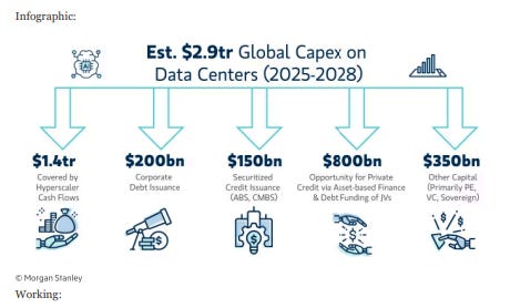 As both the FT and MS acknowledge, the hyperscalers have the cashflow to fund their investments, so they spend their times looking at the other USD1.4 trillion of investment that is coming from private markets. In my view, if the hyperscalers are spending, then the other markets will deliver the cash as well, so there is no need to think too much about credit markets.