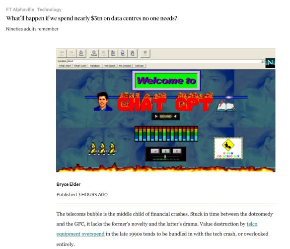 So here we are 25 years later, and an oldie is talking about a bubble bursting 25 years ago, and if you are in your 20s, you are probably thinking why is he talking about 2000, you guys were going to Blockbuster and thought Nokias were cool. I would calm yourself now, as this particular oldie is not going to talk about AI being a bubble - but I am going to look into other oldies claims that we could be a AI bubble. The FT Alphaville is conjuring up comparisons to the telecommunications bust that was part of the dot com bust.