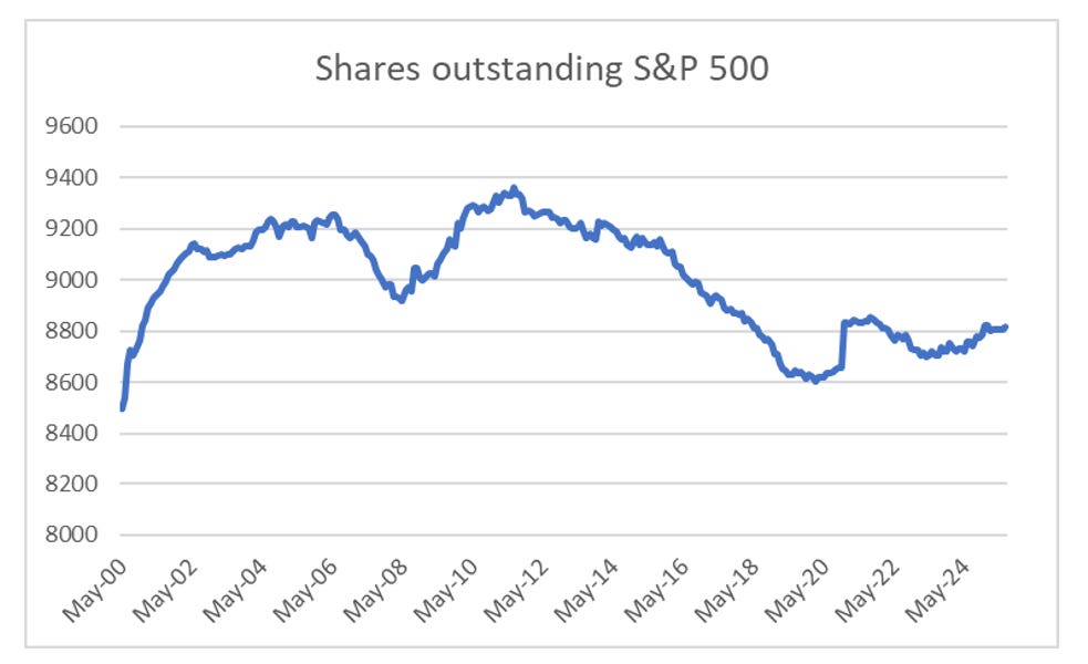 So the question to ask is why has it not fallen apart? What is different about today than back in 2000? I see three big differences. First of all, back in 2000 the dot com investment binge was fed by IPOs and share sales. The shares outstanding of the S&P 500 grew rapidly in that era, as new companies with no cash flow desperately raised capital. This always raises the risk of dilution, and eventually scares off buyers of shares - which is one reason the dot com bubble topped out in my view. Share sales are not surging today.