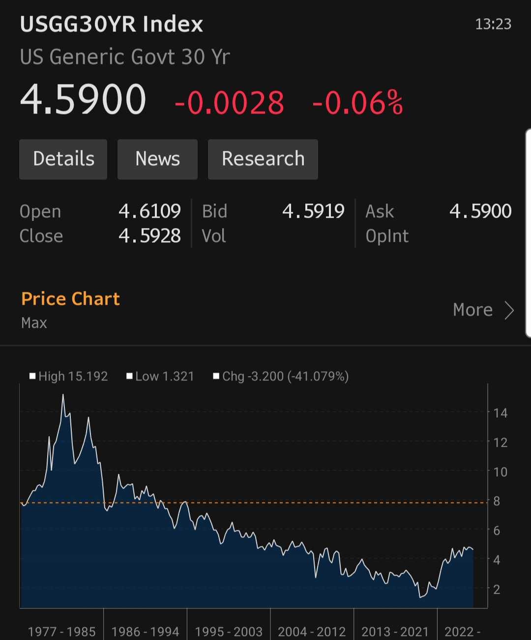 What I read from Chris would be probably bullish gold AND tech. As I have pointed out bullish tech seems to be an inflation trade so that makes sense. What I also read is that inflation is going to start surprising to the upside again very soon. That is maybe Gold/Spx is not turning now - but another sell off in treasuries is over due. 30 year US treasuries at 4.6% looks wrong. My target remains 10%.