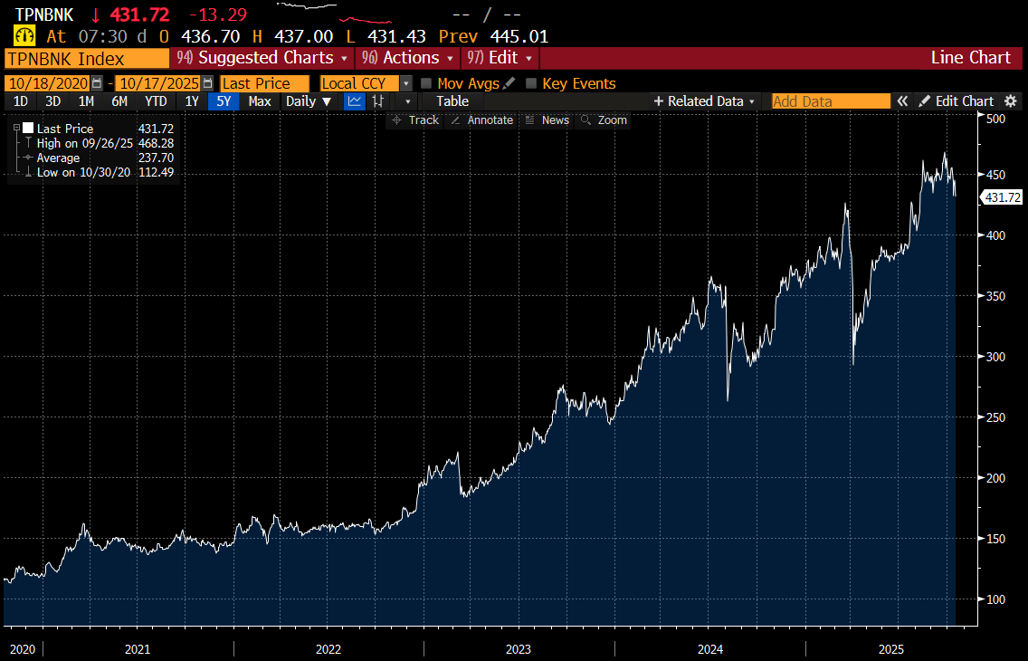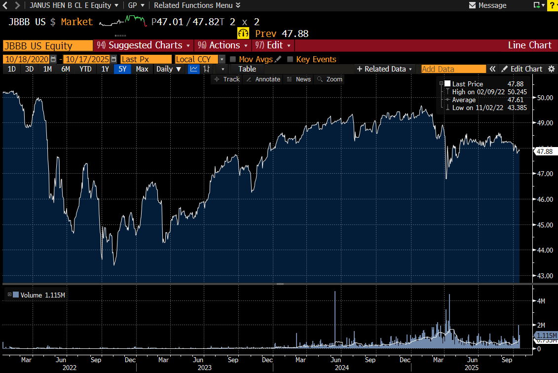 What is spooking the market is signs of fraud in the commercial lending market. If I had to guess, the collateralised loan market, and the private credit market has grown a lot recently, and we are starting to see the fruits of lack of discipline on the lending side come through. The Janus Henderson BBB CLO ETF does not look a happy place.