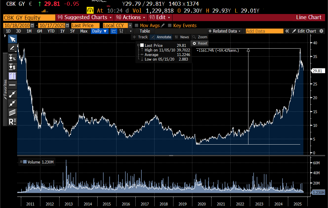 The crappy bank trade has been pretty good for investors. I like it as well as it fits in with my view of a world that is turning pro-labour. This should push up the cost of capital, and benefit banks with large deposit franchises. Generally speaking crappy banks have been centred in countries with weak property markets, and low interest rates, Japan and Germany are probably the stand out markets here. Some banks have been crappy for so long, they attract nicknames. German lender, Commerzbank, has long been known as Comedybank. In the long deflationary funk after the Eurocrisis, I went back to the well many times to short Comedybank, but since 2020, it is up 1000%.