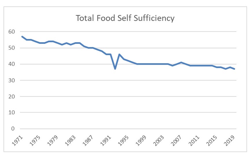 While Japan is largely self sufficient in rice production, Japan has become steadily less sufficient in total food over time. Many vegetables used in Japan come from China these days.