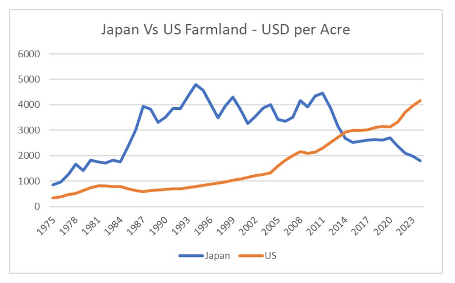 Even more extraordinary is that Japanese farm land is now half the price of US farmland.