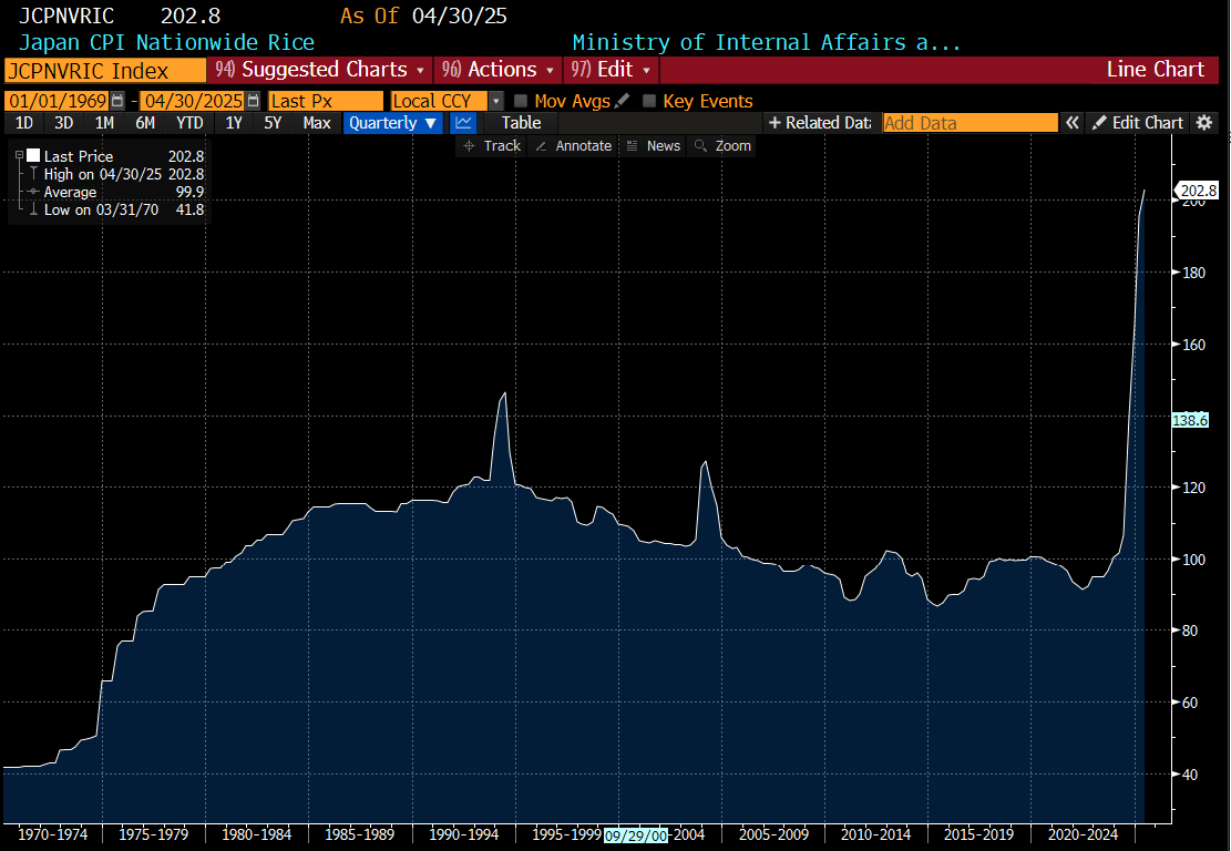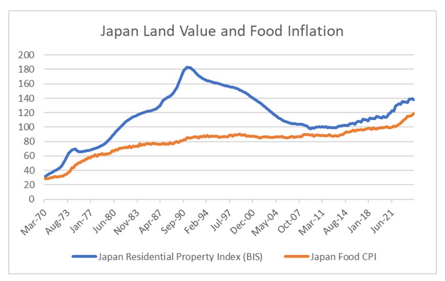 Before I go on to what policy changes this might engender, the surging rice price does make me bullish on Japanese land values. To me Japanese property prices surged well above food prices in the 1980s, and then spent three decades catching down. Assuming wages follow food prices (which they must) then Japanese property prices should do well if rice prices stay strong.