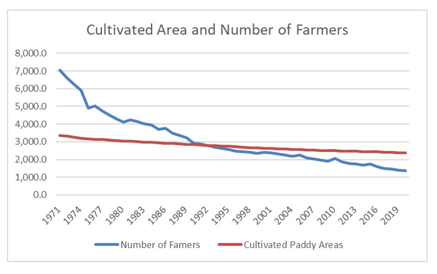 How has this come to be? Well Japanese rice prices have always been higher than the rest of the world. During the industrialisation boom years, keeping rice prices high was seen as a way of transferring wealth from the cities back to rural areas. The problem was that the government had to come in and buy production at high prices, which they did not want to do, so a policy was instituted to pay farmers to keep land fallow. This has been largely successful, with the area for cultivated paddies and number of farmers declining.