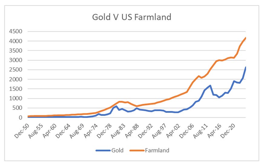 For context, US farm land has been a great inflation hedge - trading closely with gold, even to the extend that farm land weakened in the 1980s at the same time as gold.