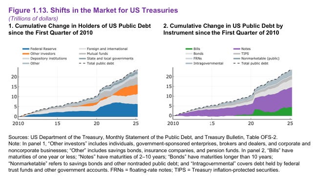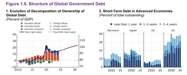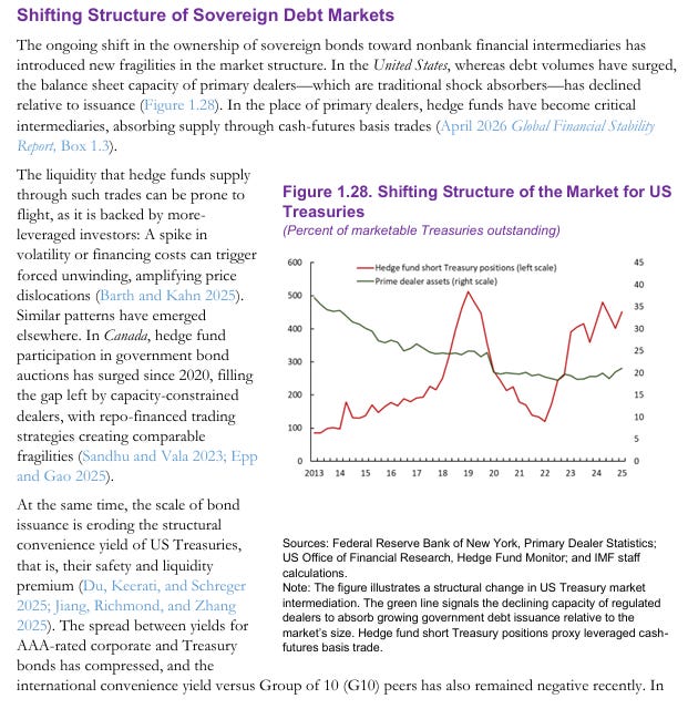 For me, the politics of a short TLT trade still make sense. But I was reading through a Chris Wood’s post on substack on Treasuries. I have read Chris Woods for a long time - and he was early on Fannie Mae and Freddie Mac, and the Eurocrisis. I always sleep better when my positioning is aligned with Chris - and he was pointing out the increasing messiness of the US treasury market. I steal some of his charts below. Let me start with some IMF charts The left hand side chart shows the rise of “Other Investors” in the US public debt (read as hedge funds) - who were virtually non-existent until 2022. This makes sense to me as “official” buyers (other countries) stop buying treasuries.