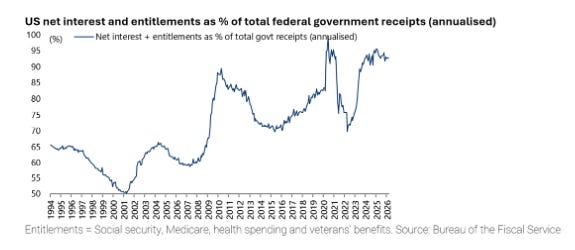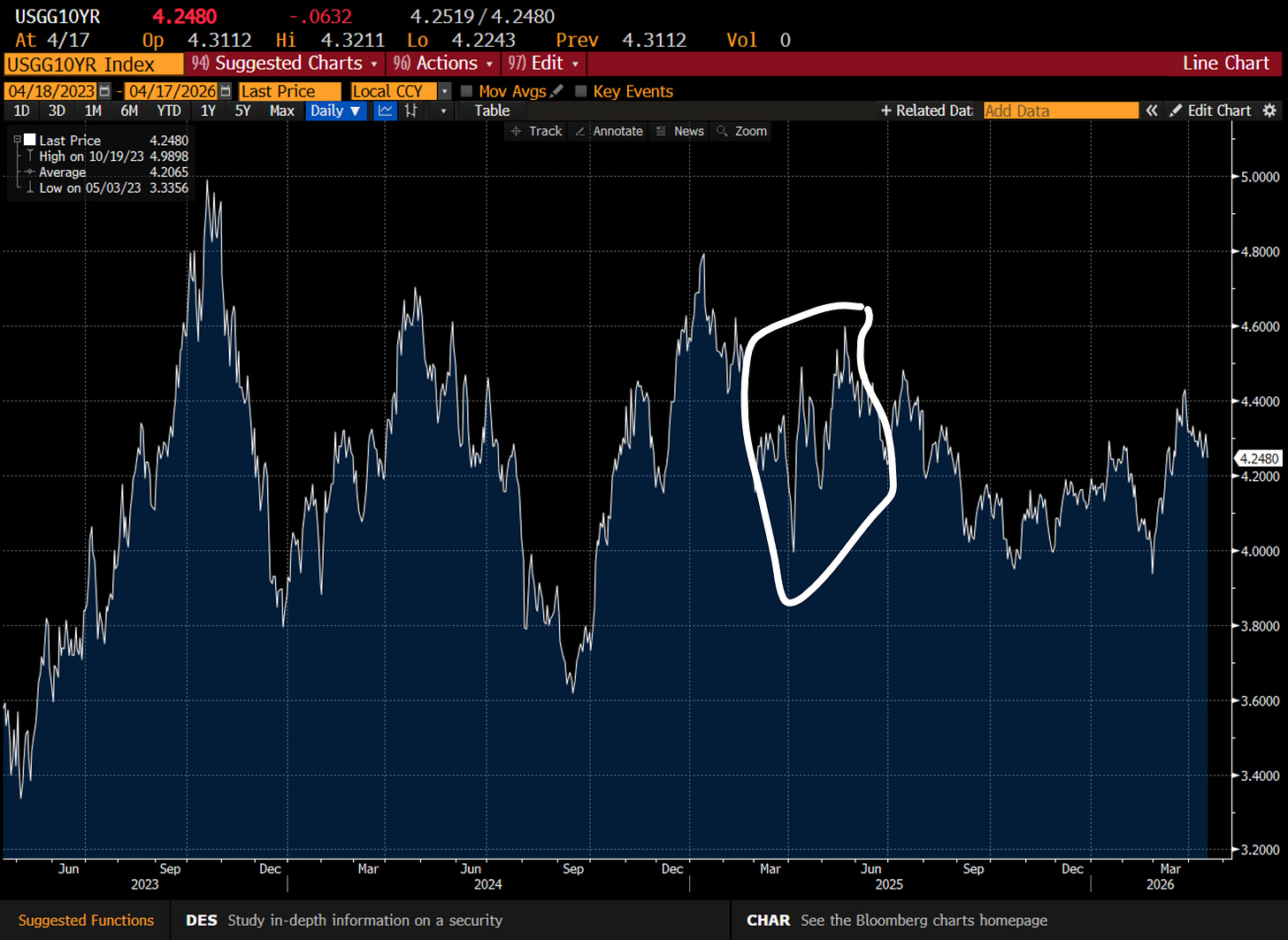 While this note is about TLT, it also answers one of the questions I have been asked to address in my upcoming investor day. Do we need long/short funds? My read, for what it is worth, is that much of the US growth story is a pure fiscal one. All the extra money that inflation and growth generates the US government is just spent - nothing is now saved for a rainy day. Or in other words, back in 2006, the US was abusing the mispricing of mortgage backed securities, today the US is abusing the mispricing of sovereign debt. The simplest trade might indeed be just long gold - but back in April of 2025, we saw treasuries sell off during the Liberation Day Tariffs sell off.
