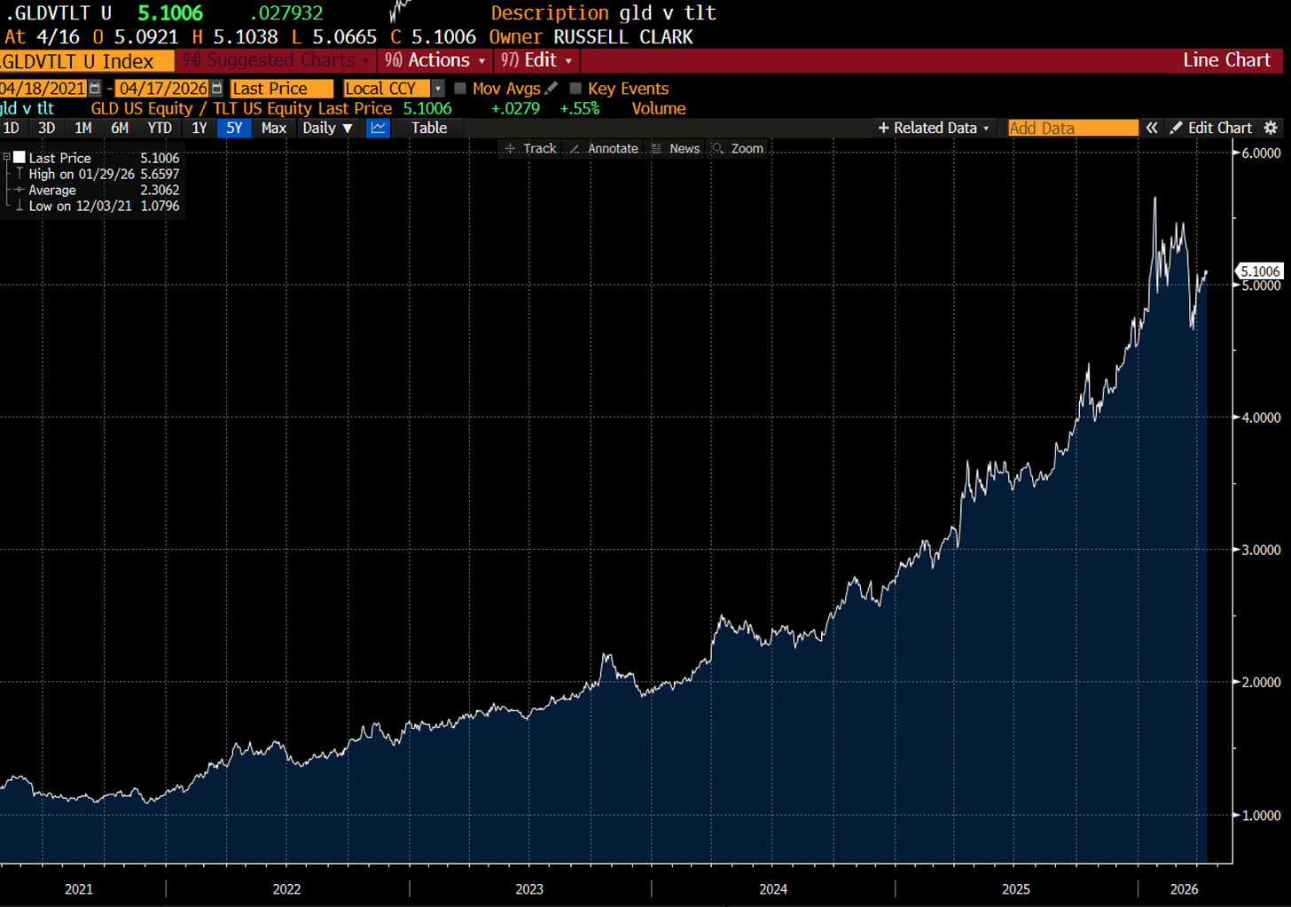I have always worked in relative terms - as I always fear political reaction to one side of my trade working. If one trade works (gold goes up, lets say), I run the risk that the Fed suddenly gets hawkish, and gold tanks. This make sense to me. But after the fact, people will say to me : “hey Russell, your short TLT isn’t working, why do you still hold it?” This is always the way - people always love the winning side of the trade, and hate the losing side. For me, personally, I cannot take the GLD side of the trade without the TLT side of the trade - it would be too risky for me.