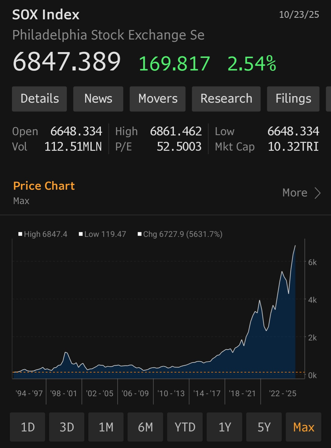 I resisted the idea of semis as the new oil for two very good reasons. Unlike oil wells, semiconductor productivity increases over time so supply is always growing. And secondly, there is no real reason why semiconductors cannot be built anywhere - its just a matter of capital and effort. Japan has a semiconductor driven boom in the 1980s that turned to bust. And Asia had the same in the 1990s. But both of these busts were driven by free trade. US developed semiconductors first, then Japan, then Asia. And I assumed China would follow suit. Obviously efforts to slow China has worked and the SOX index has been like owning oil in the 1970s.