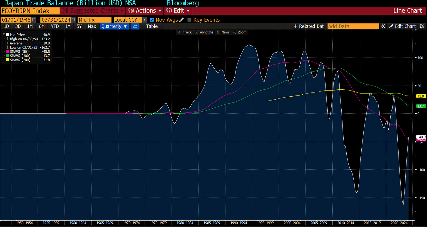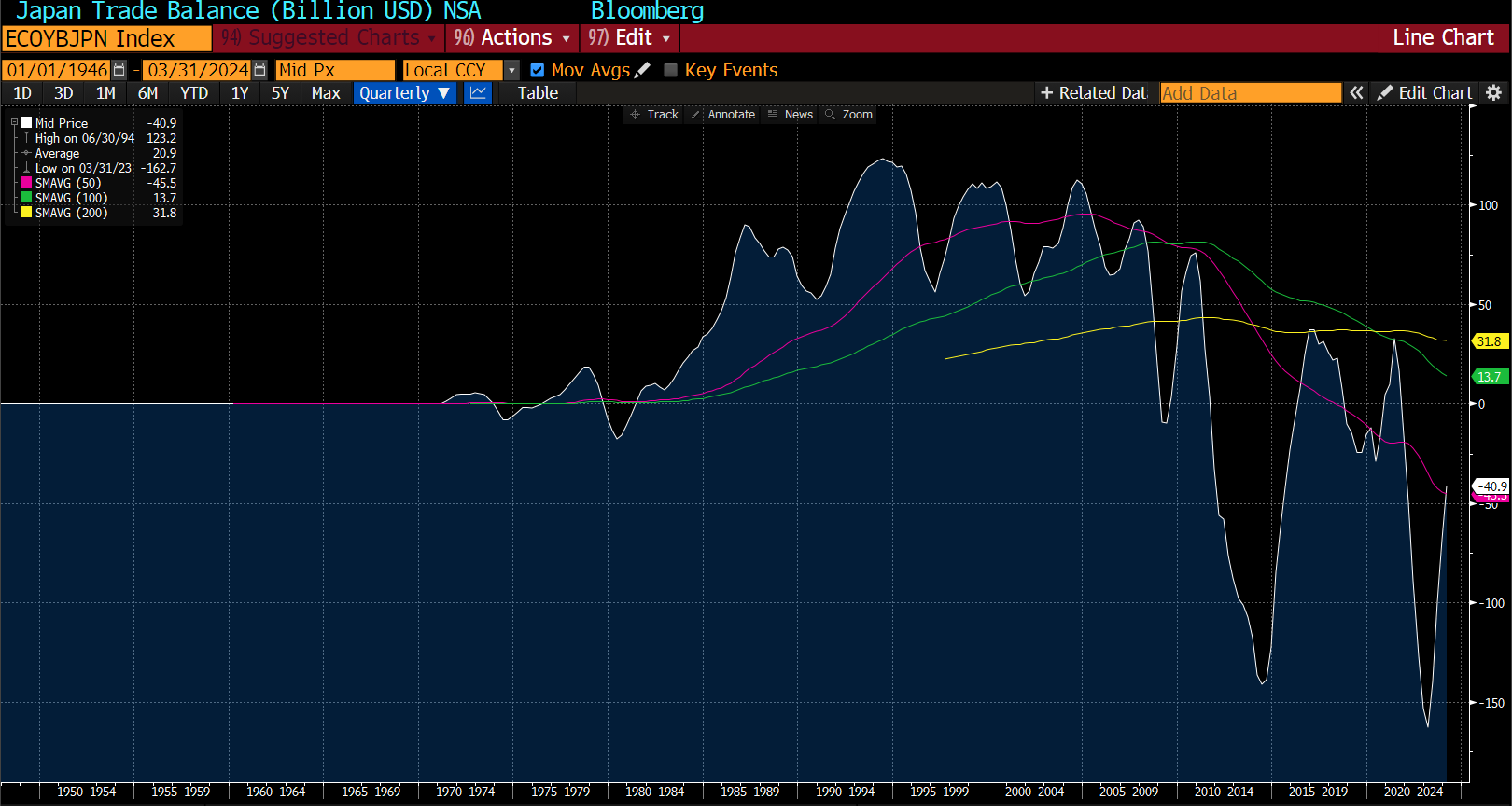 We don’t know the cost of the foreign exchange intervention at the moment, but as can be seen above, Japanese foreign exchange reserves have not been rebuilt since the last intervention in 2022. Japan also does not run the structural trade surplus that it did from 1980 to 2010.