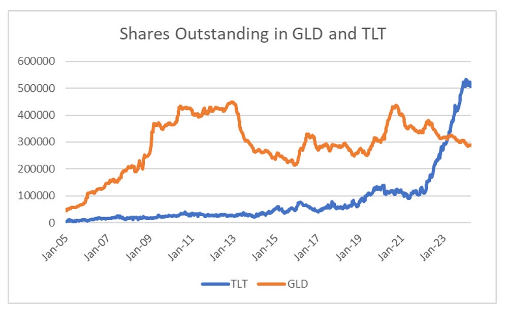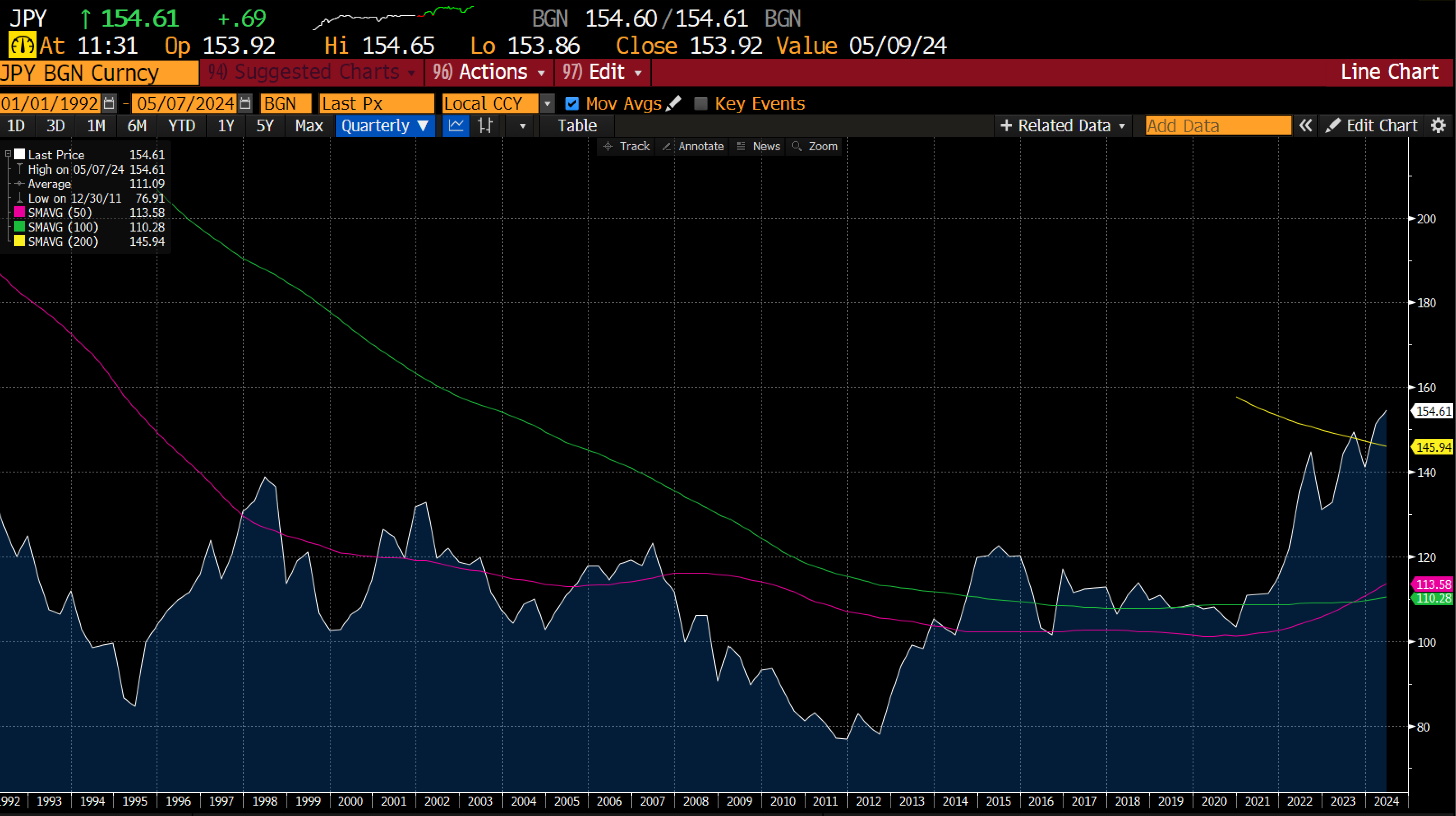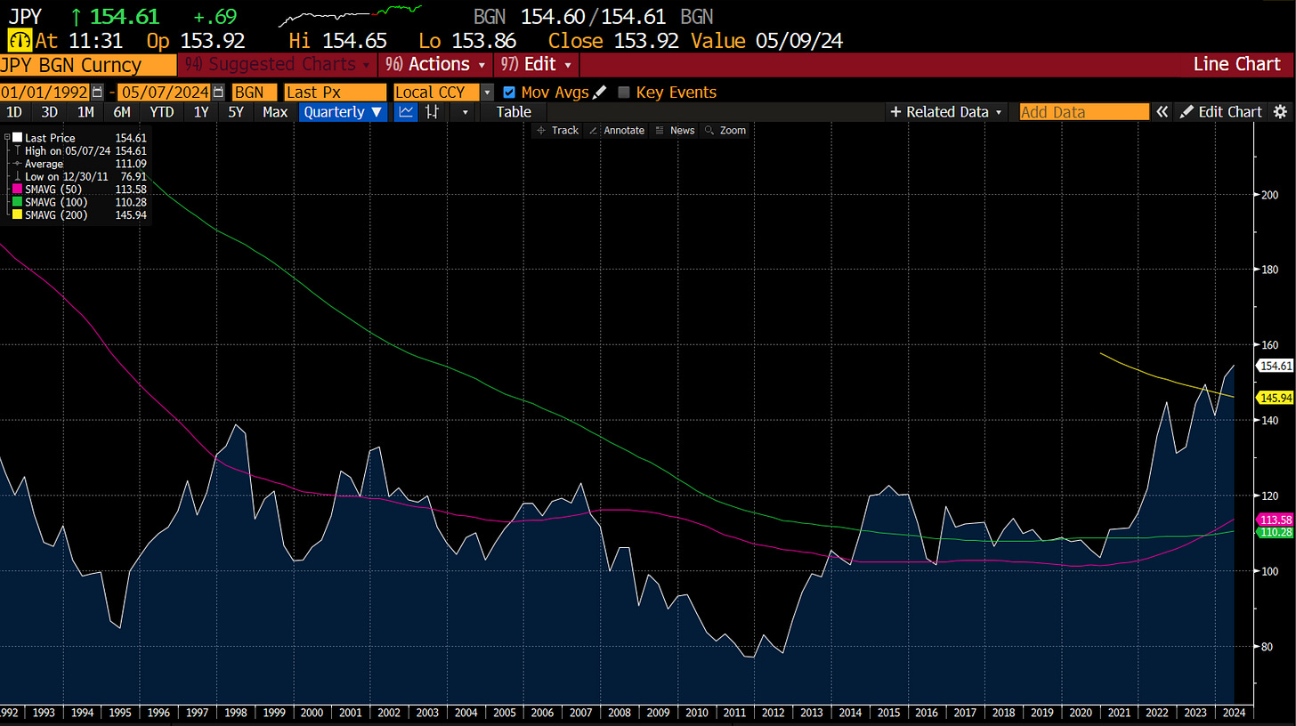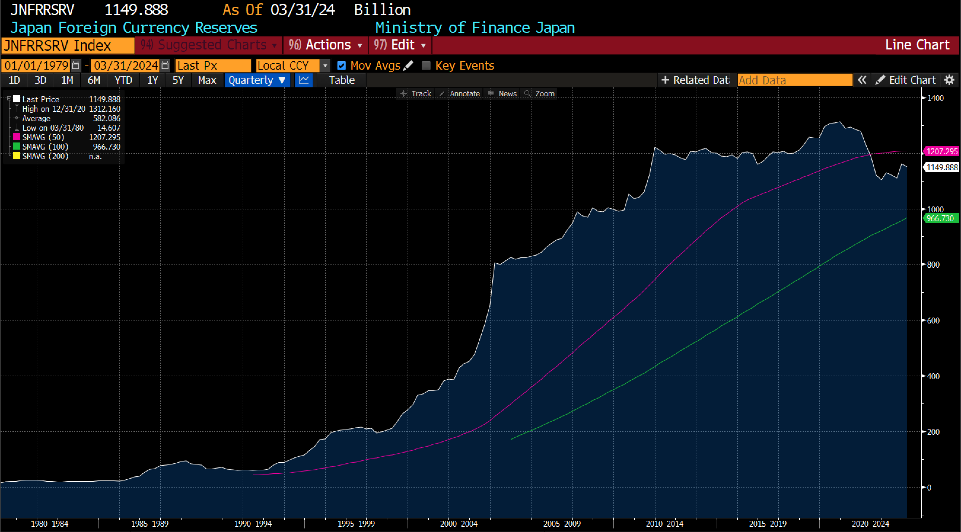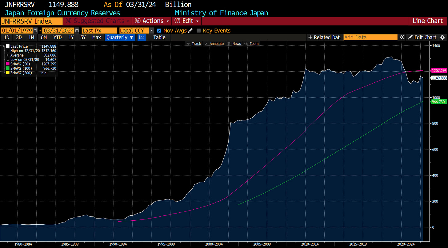 With either a Biden or Trump presidency in 2025, the chances of an austerity driven fiscal policy or a change in trade policy looks unlikely to me. The Japanese may well be caught in a doom loop, where they need to sell more foreign reserves to prop up the currency, which cause US yields to rise, which causes the Yen to weaken further and so on. Until and unless the BOJ becomes more aggressive, Treasuries look like to have a systematic buyer turn into a systematic seller. China is likely a seller of treasuries and buyer of gold for political and strategic reasons, and Japan is a seller of treasuries for economic reasons. I am still baffled to why retail investors prefer treasuries to gold.