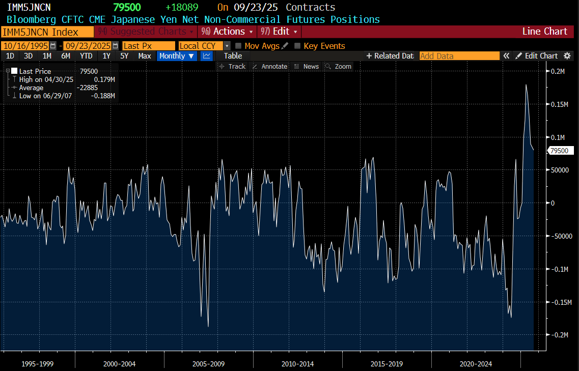 But free markets are not longer. And the BOJ and the Government LOVE a weak Yen, and crucially, the US does not seem that bothered. Probably the move to tariffs makes it hard for the US to preach free market philosophy to its trade partners. This is what makes the Yen so hard to read. It is very cheap, but there is no political consensus that is should strengthen. Despite this, macro managers are repeating the mistake they made with JGBs. They keep expecting yen to appreciate, so early this year were the longest ever in Yen (according to CFTC data).