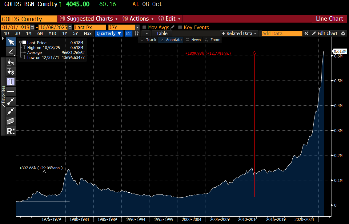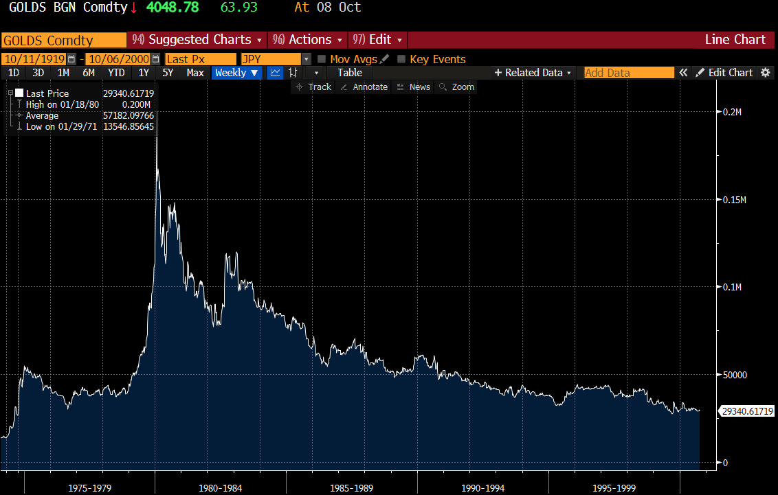 In the pro-capital/pro-free trade era from 1980 to 2000, we learnt that the Yen was a hard currency. For all the fiat/debasement traders, out there, Japan was a true widowmaker market. With rising debt levels, and a fiscal deficit, and a central bank putting interest rates to zero, you would have assumed gold in Yen terms would have soared at least during the 1990s. You would have been wrong. The gold price in Yen terms fall back to 1971 levels by 2000.