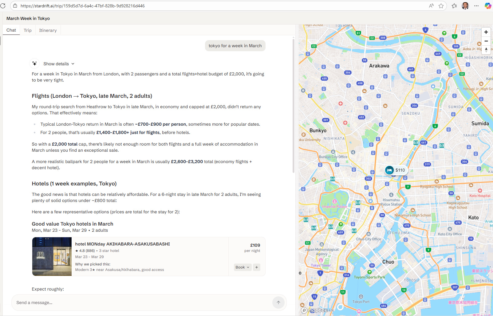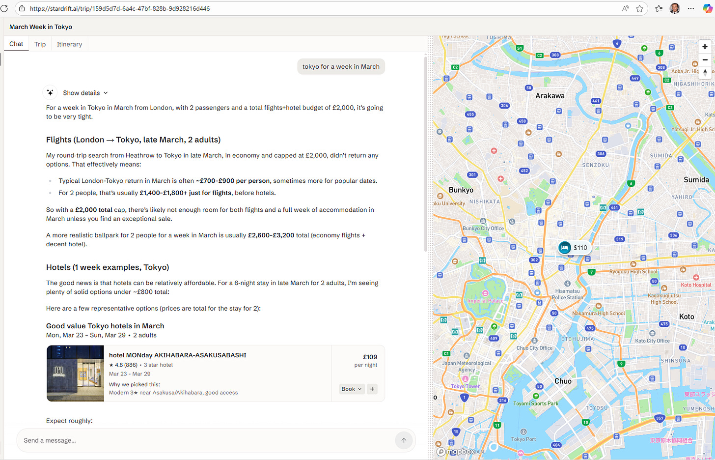 I know a lot of people that are bearish on AI, but for me I struggle to get that bearish. Somewhat unusually for me, I have invested in to two tech start up in recent years, and both are now moving down the AI agent route. I typically do not like start ups, but I tend to invest in people, and both these start ups are run by people I trust. The first one I am invested in called Stardrift, and it is run by niece out of San Francisco (the one that recently got married). My niece, Leila Clark, is brilliant - but there are a lot of brilliant people out there - but she is also trustworthy - which is a far rarer quality. Stardrift is an travel app that plans trips for you. I have played around with it, and it is very good. It remember previous preferences and can plan an entire trip around a budget. Below is a screenshot.
