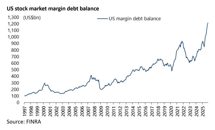 As mentioned in a previous post, one analyst I always make time to read, and generally want to be positioned the same way as is Chris Woods. A subscriber helpfully pointed out that he does indeed publish on Substack - and he has just written a piece entitled, “The US is Now One Big Bet on AI”. Most of the charts in his note should be familiar to people of a bearish disposition, but I had missed the surge in margin debt that has happened recently.