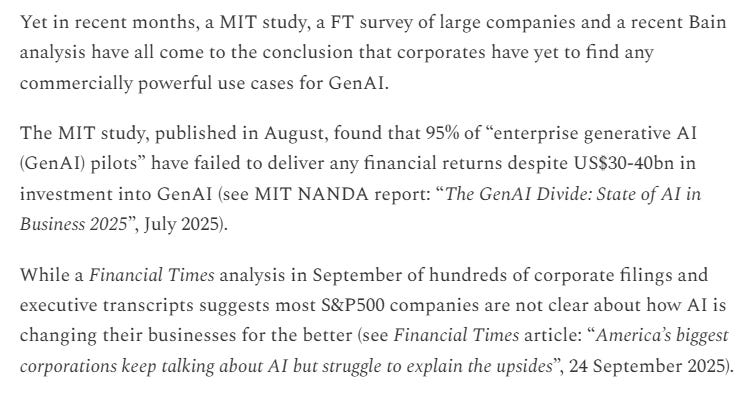 I am invested in these AI plays, mainly from relationship perspective, not from any strong view on AI. But what I do get from both Leila and Tony is that customer acceptance of AI is very high. People are very willing to try these products, and when they do, they are finding them useful. In recent month I have seen a lot of publicity about studies finding companies struggling to work out how to use AI. Below is from Chris Woods.
