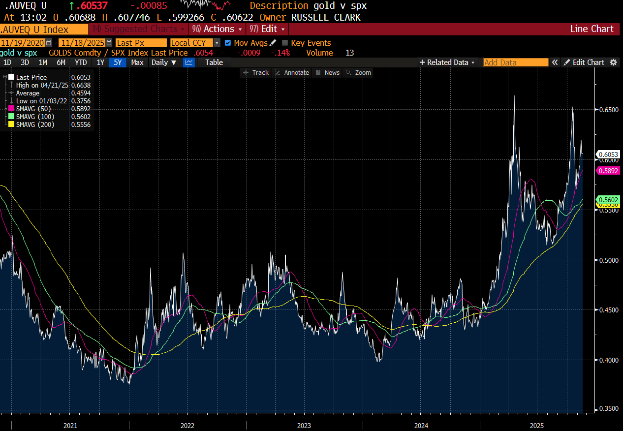 In the original pro-labour thesis, the idea was that markets would be okay, but that higher yields on bonds would act as a dampener on financial assets. The reality was that we saw equities do very well. I wondered if my original thesis was wrong, and then suddenly markets are trading like I expected again. Strange days indeed. Probably the biggest tell has been the movement of gold v S&P 500. It came back to the 200MDA, and then bounced again.