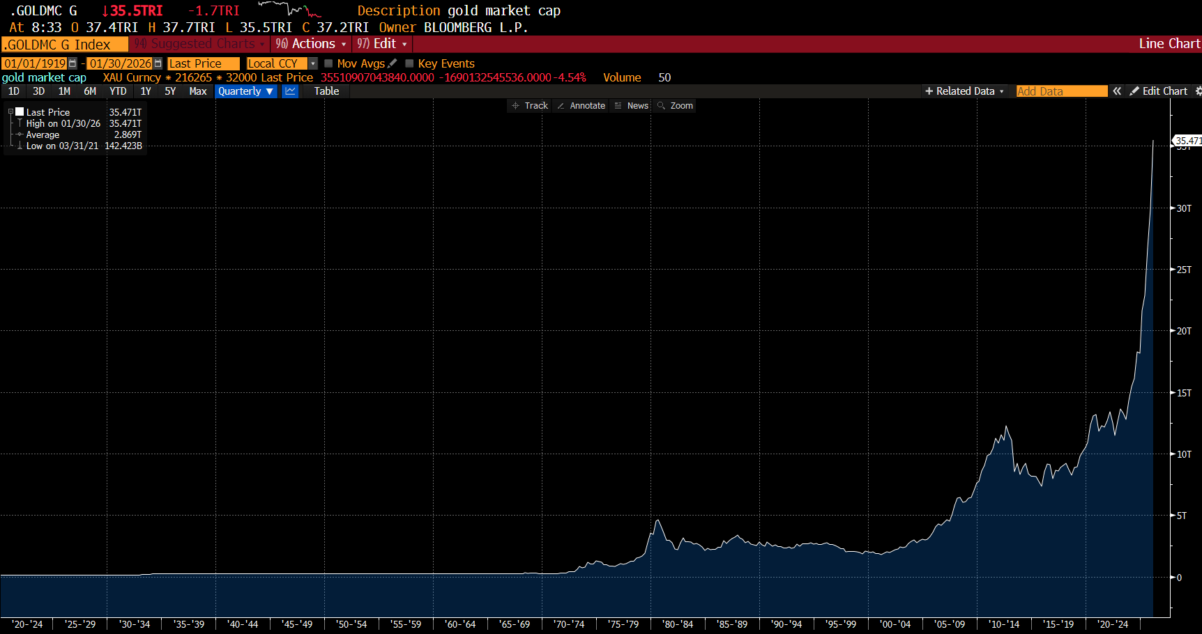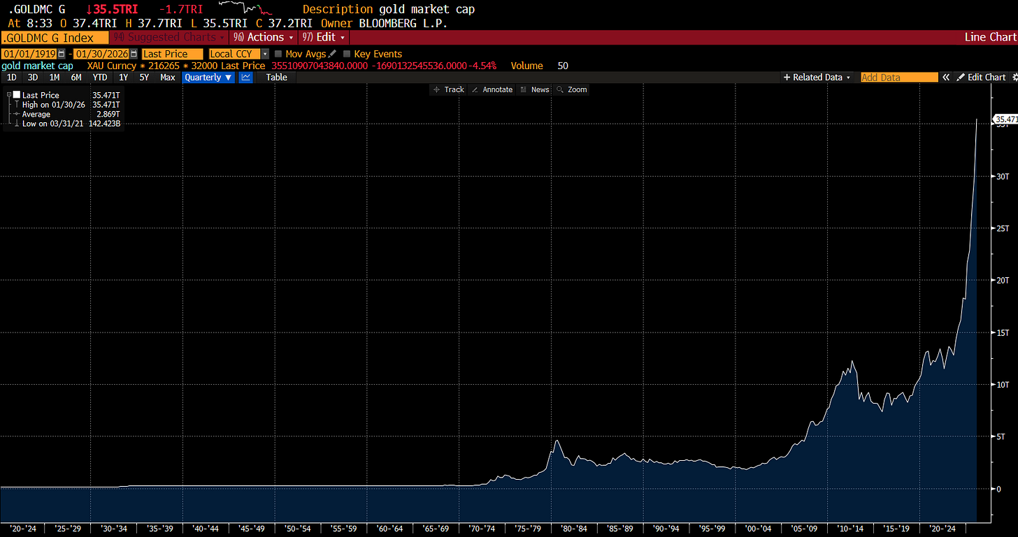 Surging gold has pushed the market capitalisation of gold to USD 35 trillion. As gold supply does not increase that much - this is just telling you the price has moved a long way.