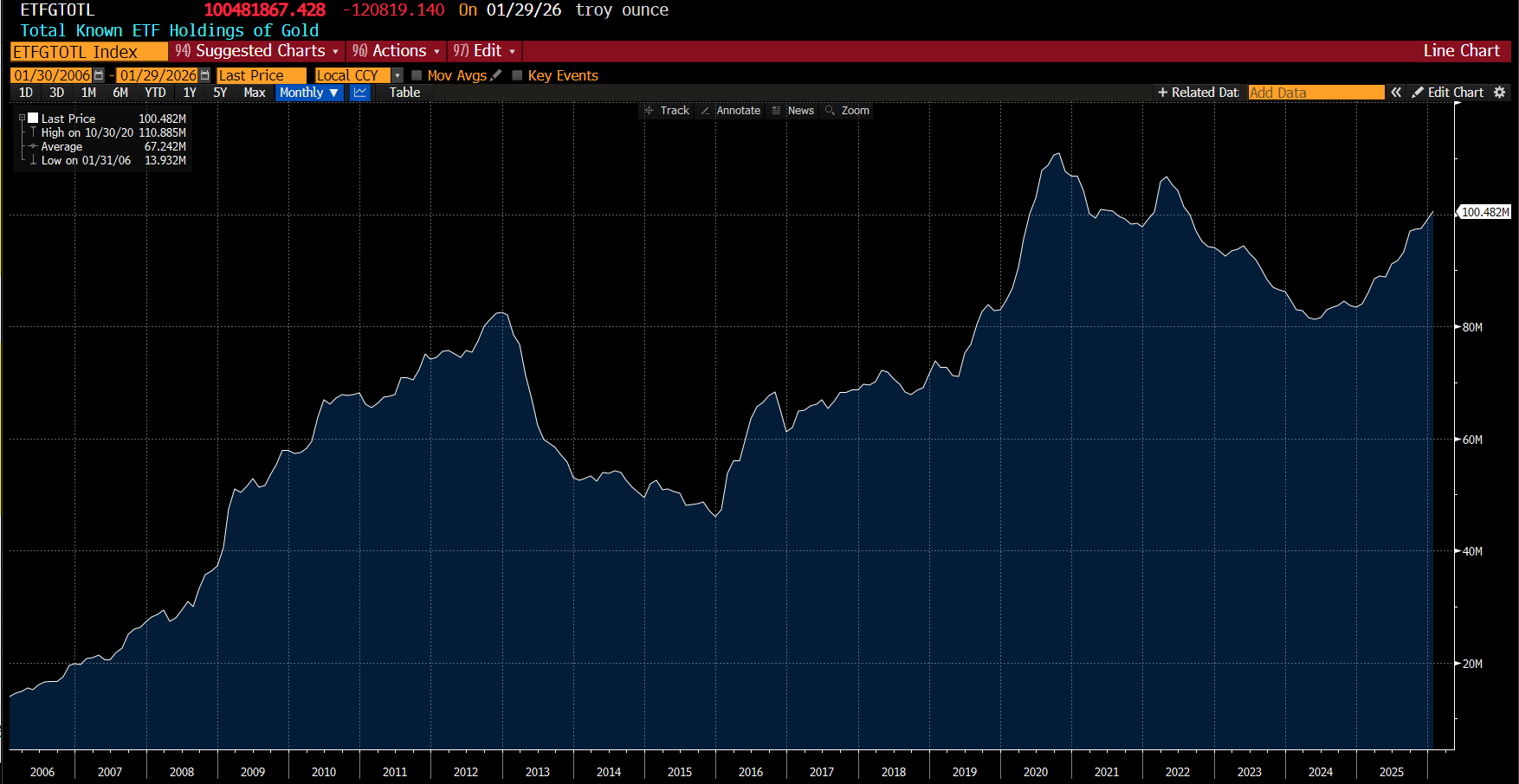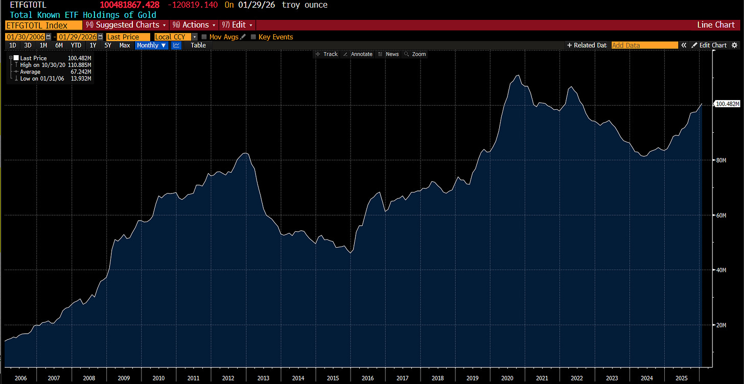 I am often asked about the other precious metals, and I would say, I don’t know if central banks are buying silver/platinum etc - so I would rather stick to gold. The problem is that as the chart above shows, we have moved a long way now. Are we done? Are we all Gollum grasping at gold ring as we fall into the lava of Mount Doom? Well lets start with the bearish parts first. Total ETF holdings are back to relatively high levels. Being long gold from 2022 to 2024, falling ETF holdings offered a lot of comfort. No more.