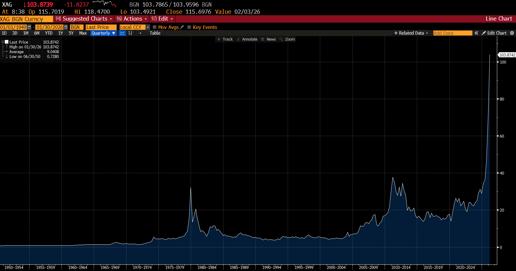 Adding to the unease is that silver, which is equivalent of golds sleazier young brother is cashing in on the boom. When silver has spiked, we are near the end historically.